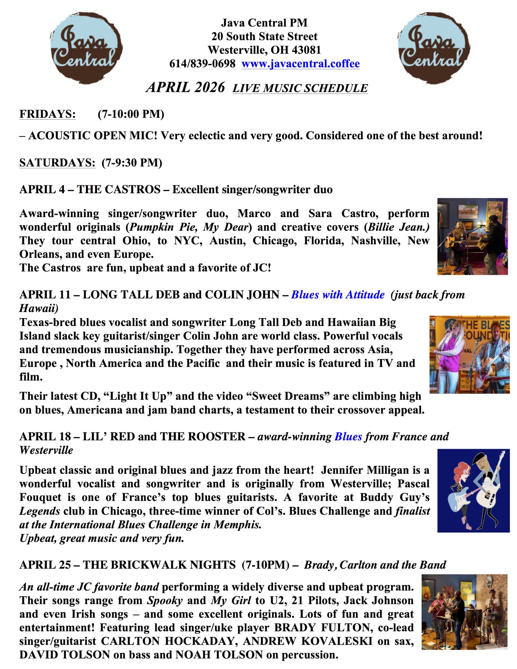 Java Central is a popular live music venue in central Ohio, featuring top local, regional and even national performers. Rock, blues, country, jazz, singer/songwriters.