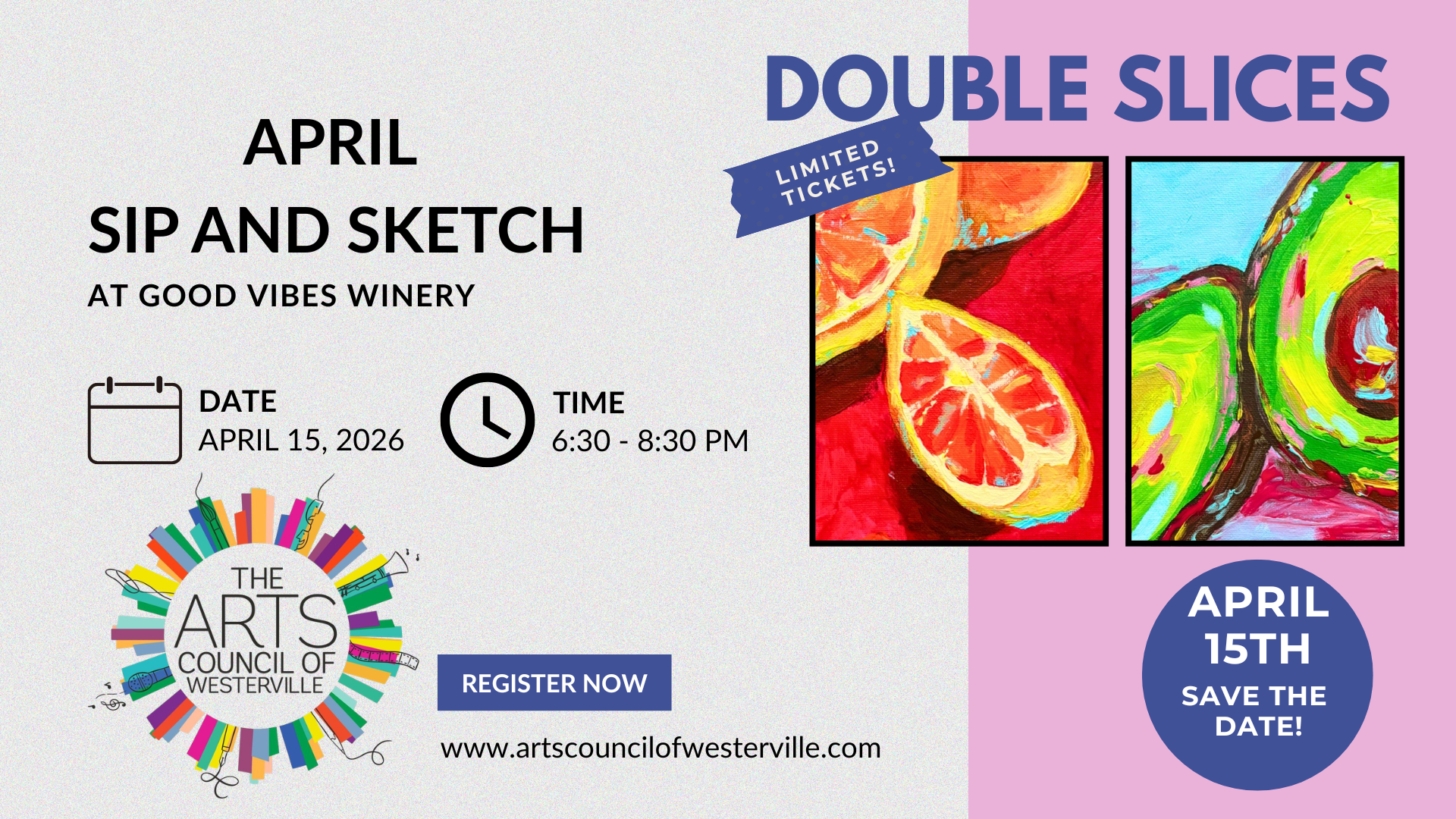 Date: Wednesday, April 15, 2026 6:30-8:30pm Location: Good Vibes Winery Theme: Double Slices Instructor: Kelly Gurich Description: Explore acrylic brushstroke technique by creating 2 small paintings of seasonal fruit on stretched canvas. Our painting classes are different than traditional painting classes because participants are encouraged to pursue individual choice based on a theme. […]