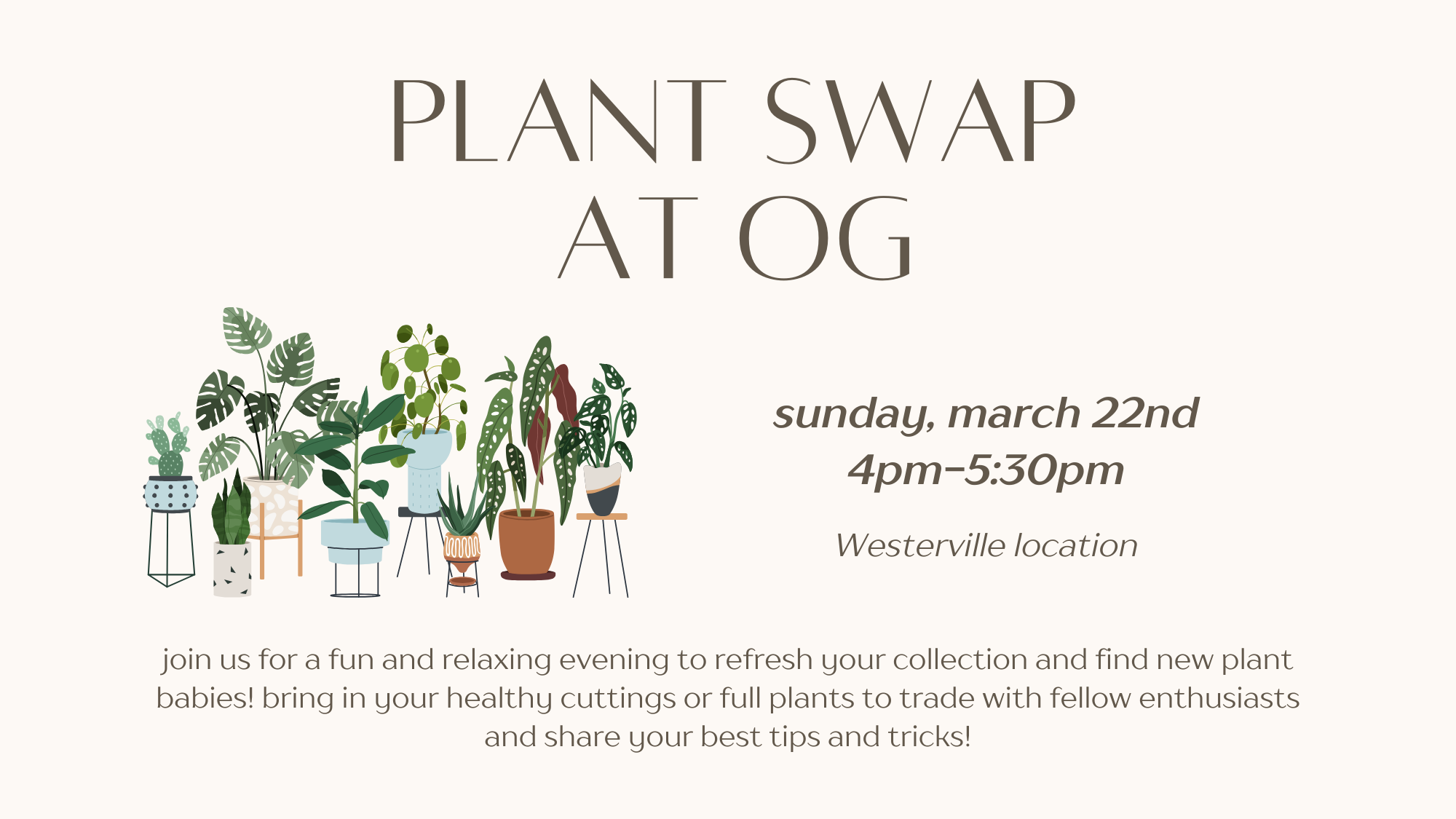 celebrate the joy of plants and community at our upcoming plant swap! whether you're a seasoned plant parent or a beginner, this is the place to be. come connect with fellow plant enthusiasts, and share your best tips! you can bring healthy, pest-free cuttings, small potted plants, or even extra pots and tools! swap with […] |