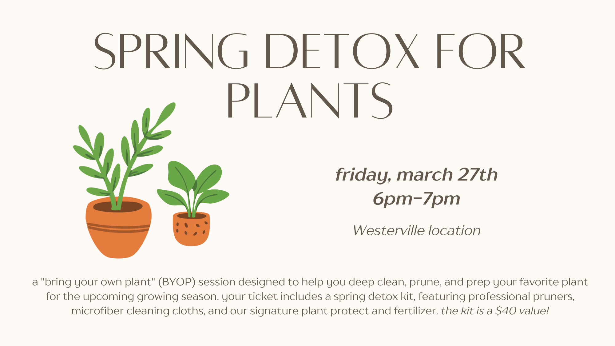 give your greenery the spa day it deserves! this is a "bring your own plant" (BYOP) session designed to help you deep clean, prune, and prep your favorite plant for the upcoming growing season. your ticket includes a spring detox kit, featuring professional pruners, microfiber cleaning cloths, and our signature plant protect and fertilizer. we’ll […]